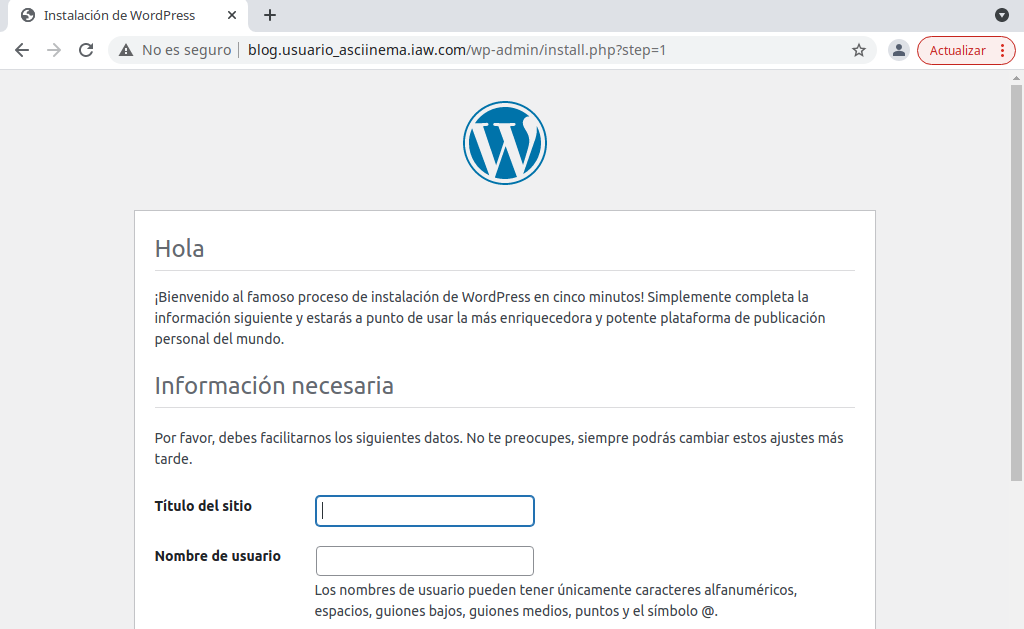 En tanto al sitio de WordPress, vemos que la instalación y la conexión con la base de datosse ha realizado correctamente y está listo para que el usuario lo configure:
