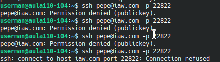 Hemos intentado conectarnos varias veces mediante SSH, como vemos en la siguiente imagen, hemos sido bloqueados después de varios intentos fallidos: