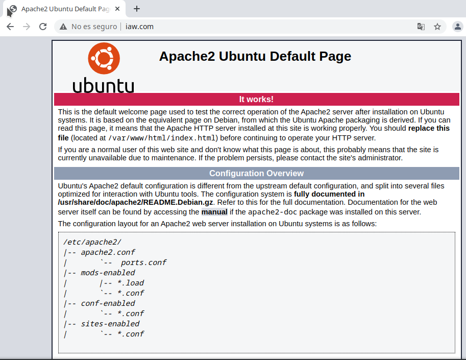 Si iniciamos el servicio con service apache2 start y accedemos desde un navegador (ya sea utilizando iaw.com o la dirección IP, 192.168.56.10) veremos la página de inicio de apache. Esto nos indica que está funcionando correctamente y listo para aceptar peticiones.